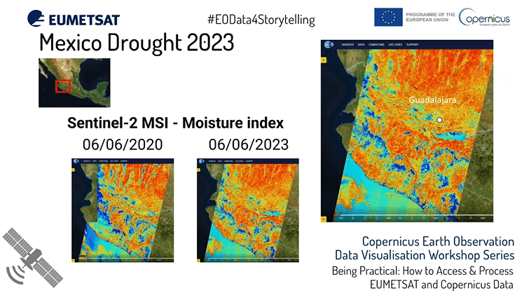 While reporting on similar calamities, it is possible to access the WEkEO data viewer and download the necessary information with a few clicks. In the case under examination, our expert made use of the Moisture Index dataset of Sentinel-2 to highlight the difference in moisture levels between the month of June of 2023 and the same month in 2020, adding great credibility to the piece.