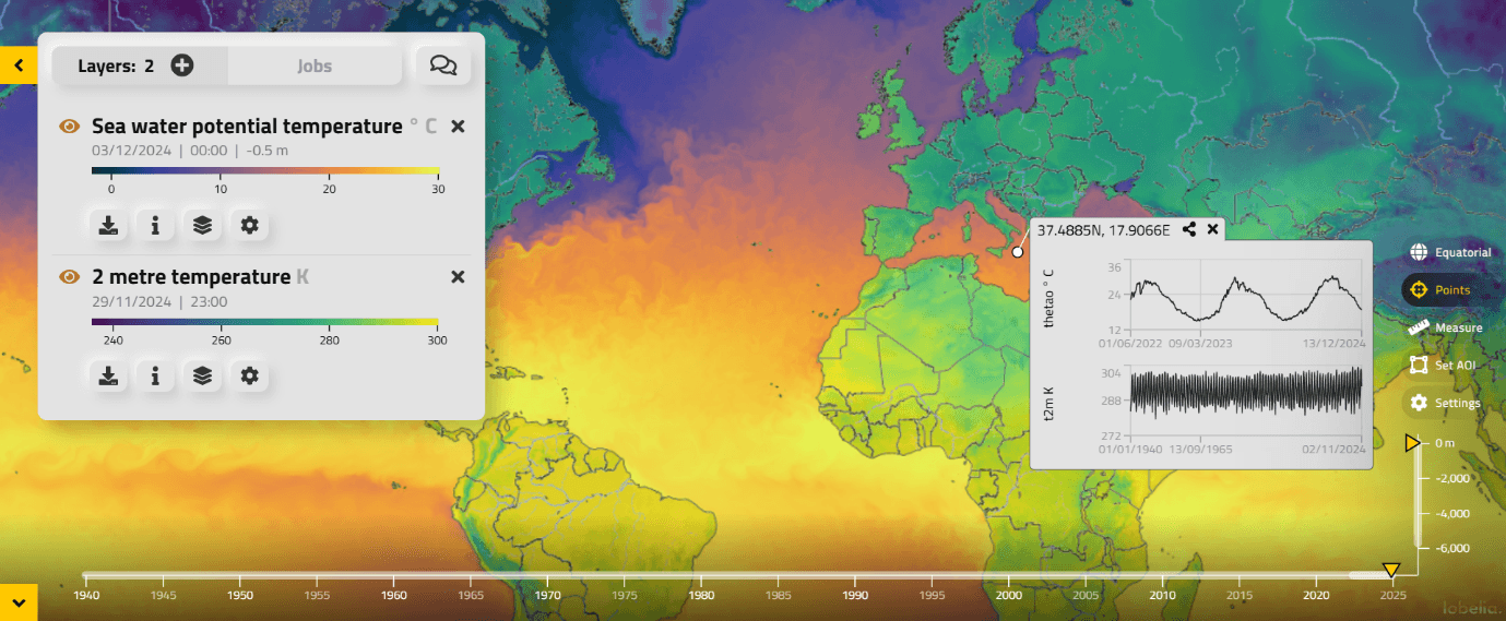 This capability will expand over the next year when additional ARCO-based datasets from C3S and CAMS will be integrated. These new datasets will not only be accessible through the WEKEO Viewer but will also fully support the time series feature.